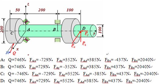 42.[单选题]已知轮C半径为Rc=100mm,轴的半径为r=50mm,Px=466N,Py=352N,Pz=1400N。则平衡时力Q和轴承A、B的约束反力为() (Q作用在C轮的最低点)