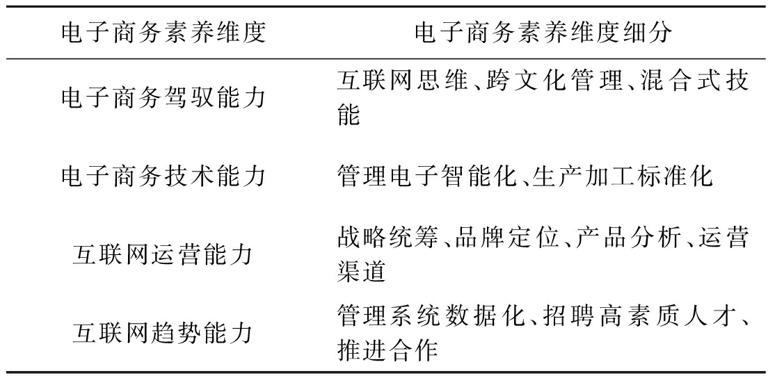 2.2 餐饮管理人员电子商务素养的理论框架“互联网+”时代下,餐饮企业与电子商务的融合不是简单的半电子化半手工管理,餐饮管理人员对餐饮企业的发展起到至关重要的作用。针对“互联网+”时代餐饮管理人员电子商务素养的要求,我们划分了餐饮管理人员电子商务素养的维度,分别是:电子商务驾驭能力、电子商务技术能力、互联网运营能力、互联网趋势能力,并将四个维度进行细分如表1所示。