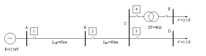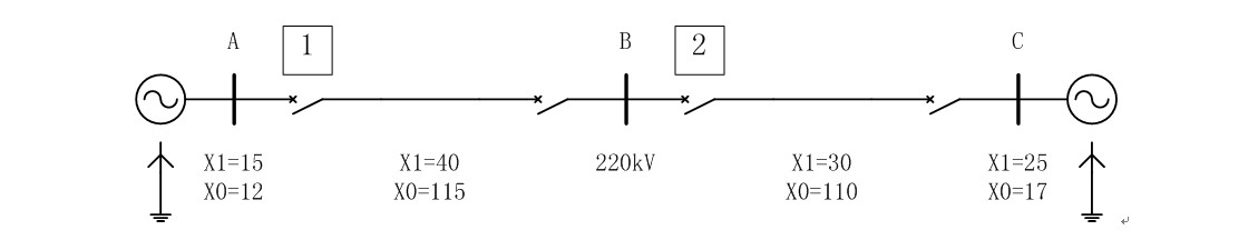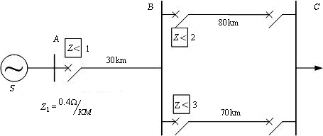 如图所示,在110kV输电线路中,线路AB的负荷电流为175A,系统阻抗为:XS=4Ω,单位线路长度的阻抗为:x=0.4Ω/km,kⅠkel=1.25,kⅡkel=1.15,kⅢkel=1.2;kSS=1.5;kre=0.85。计算:保护1的电流速断保护、限时电流速断保护、过电流保护动作值与动作时间。