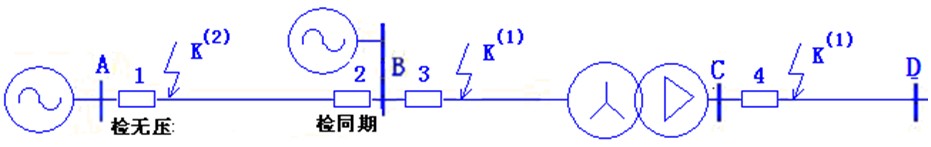 系统如图所示。线路上分别配置有相间电流保护为相间故障保护,零序电流保护为接地故障保护。简述:(1)保护1、2、4出口分别发生瞬时性故障K(2)、K(1)时,各保护动作过程及动作时间;(2)AB线路瞬时故障时,检无压和检同期重合动作过程。