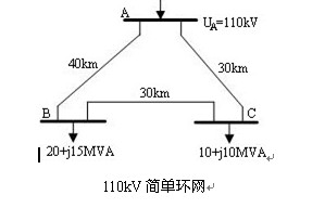 某110kV环网如图所示,线路AB和AC为LGJ-95型导线,AB的参数为RAB=13.2Ω,XAB=17.16Ω,BAB/2=5.3×10-5 S;AC的参数为RAC=9.9Ω,XAC=12.87Ω,BAC/2=3.975×10-5 S。BC为LGJ-70型导线,参数为RBC=13.5Ω,XBC=13.2Ω,BBC/2=3.87×10-5S。若变电站A的母线电压为115kV,试计算该网络的功率分布和变电站B和C的电压(不计电压降落横分量)。